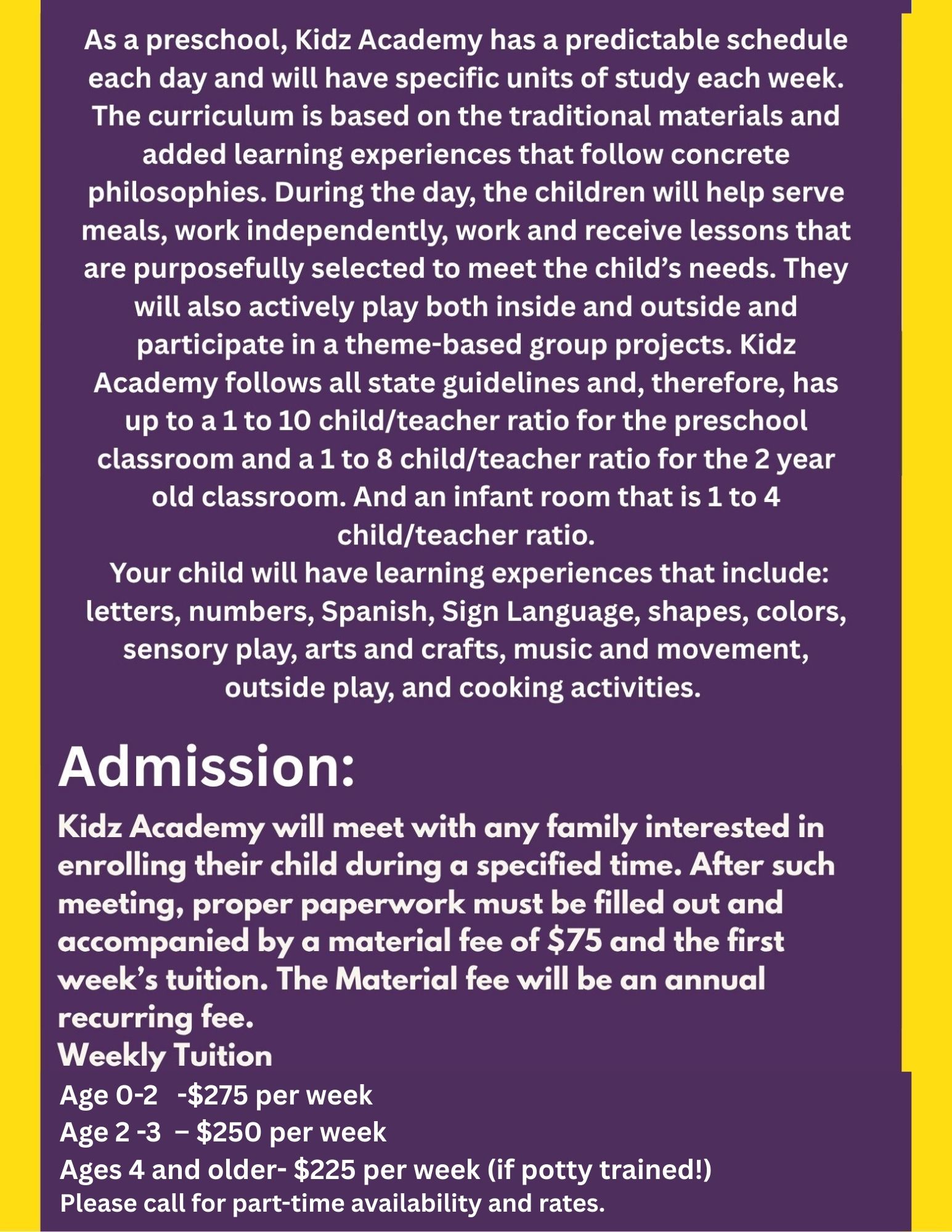 Admissions and Student/Teacher Ratios At Kidz Academy Daycare in St Charles, MO